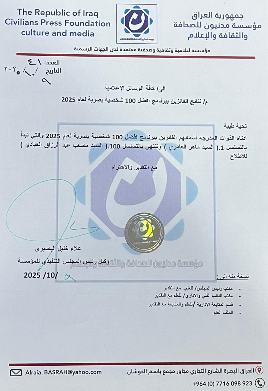 مؤسسة مدنيون للثقافة والاعلام تعلن اسماء الفائزين ببرنامج أفضل 100 شخصية بصرية لعام 2025 و...