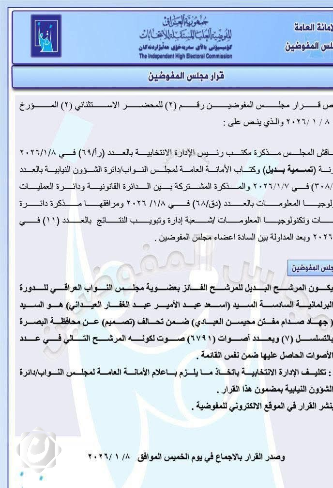 أعلنت المفوضية العليا المستقلة للانتخابات عن تنازل محافظ البصرة، أسعد العيداني، عن مقعده النيابي لصالح المرشح جهاد صدام العبادي، ليصبح عضواً في مجلس النواب العراقي بدلاً منه.