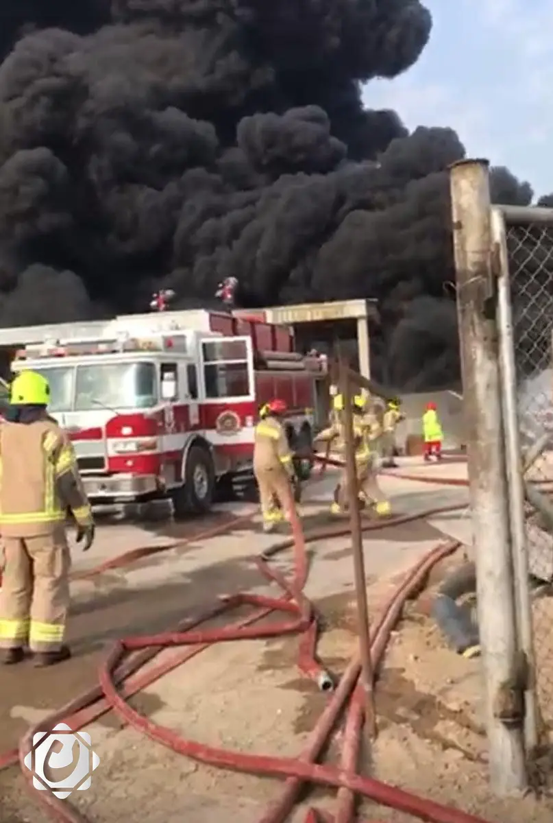تواصل فرق الإطفاء جهودها لإخماد حريق نشب في خزان بالمحطة الخامسة في الرميلة الشمالية.