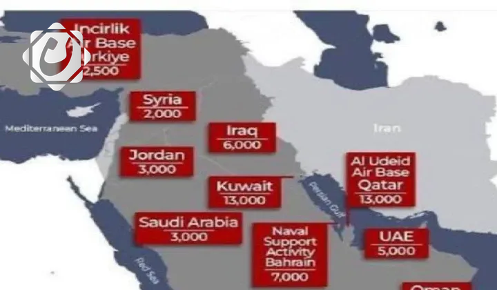 وأوضح عزيزي، في منشور عبر منصة 'إكس'، أن 'الخريطة تعرض مواقع انتشار القوات الأمريكية وأعدادها التقريبية، ومن بينها قاعدة إنجرليك الجوية في تركيا (نحو 2500 جندي)، وقواعد في سوريا (قرابة 2000 جندي)، والعراق (حوالي 6000 جندي)، والأردن (3000 جندي)، والكويت (13000 جندي)'.