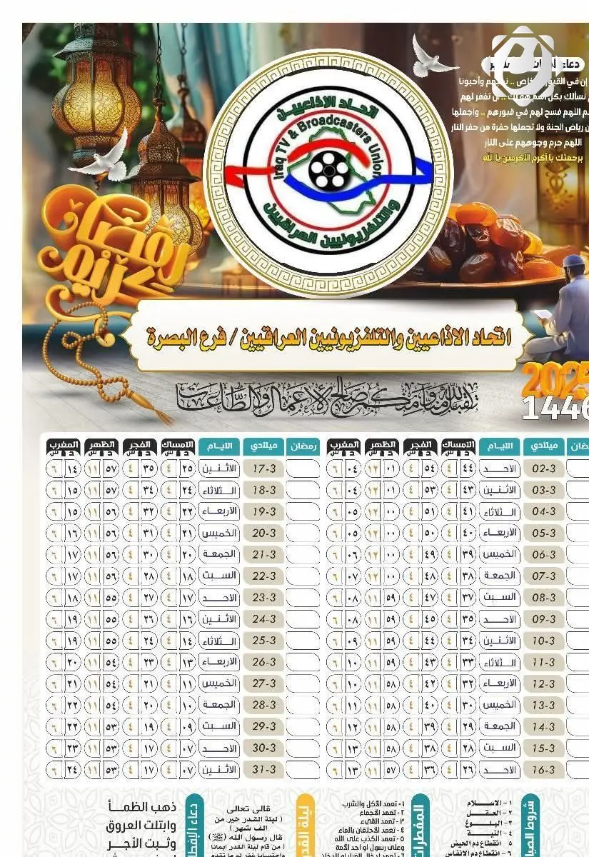 بدأ اتحاد الإذاعيين والتلفزيونيين العراقيين فرع البصرة بتوزيع إمساكية شهر رمضان المبارك على جميع أفراد المجتمع في البصرة. وأوضح الزميل فاضل السوداني، مدير المركز الإعلامي للاتحاد، أن هذا التوزيع يأتي في إطار الخطة الفصلية للاتحاد، حيث تسعى كوادر الاتحاد لتوفير الإمساكية التي تعين المواطنين على معرفة مواقيت الصلاة خلال الشهر الفضيل.